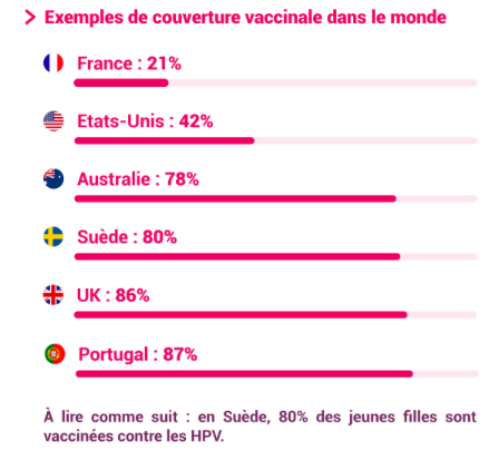 Mais surtout, le vaccin, qui permet de se protéger de 60 à 90 % des lésions pré-cancéreuses, est boudé par la France. Il est aujourd’hui proposé aux jeunes filles de 11 à 19 ans et aux hommes ayant des relations homosexuelles jusqu’à 26 ans. Moins d’un quart des adolescentes sont correctement vaccinées (deux injections) alors que l’objectif est de 60-70 %.